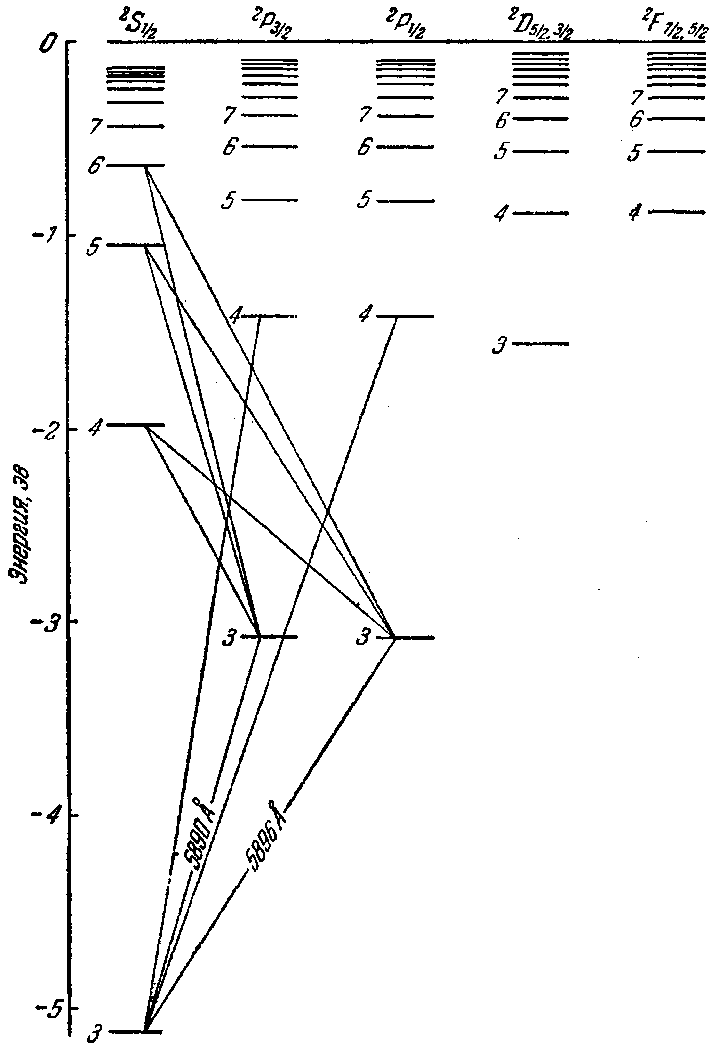 одно и то же(см. табл.), приходится предположить, что уровни S являются одиночными (синглетами), а уровни Р — двойными (дублетными) (см. рис. 204). Дальнейший анализ спектра натрия показал, что уровни D и F также являются двойными.