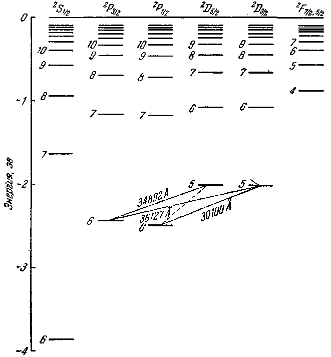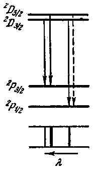 расщепление у цезия значительно больше, чем у натрия. На схеме цезия видно, что тонкая структура диффузной серии состоит не из двух линий, а из трех: