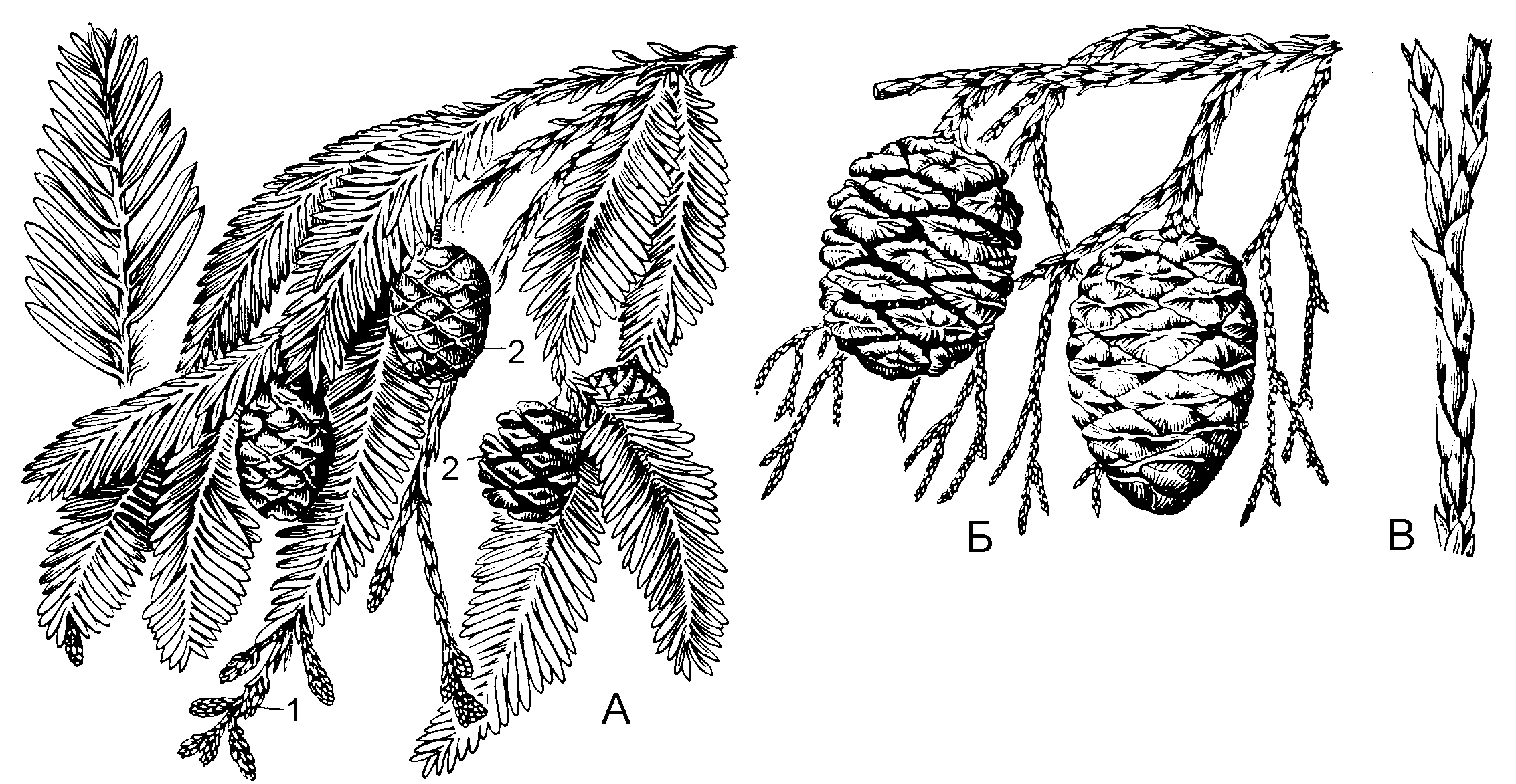 А – секвойя (Sequoja sempervirens) с мужскими (1) и женскими (2) шишками;