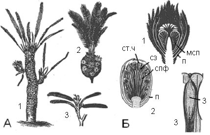 А – реконструкция внешнего облика: 1 – вильямсония; 2 – цикадеоидея; 3 – вильямсониелла; Б – репродуктивные органы: 1 – разрез через стробил цикадеоидеи; 2 – разрез через женскую часть стробила; мсп – микроспорофилл; п – периант; спф – мегаспорангиофор; сз – семязачаток; ст.ч – стерильная чешуя; 3 – продольный разрез через семя; з – зародыш.