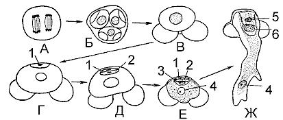 А – деление археспориальной клетки; Б – тетрада микроспор; В – микроспора; Г-Е – образование мужского гаметофита (пыльцы); Ж – прорастание пыльцы: 1-2 – проталлиальные клетки, 3 – антеридиальная клетка, 4 – вегетативная клетка, 5 – клетка-ножка, 6 – спермагенная клетка.