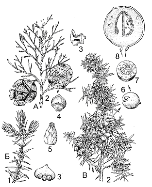 А – репродуктивный побег кипариса вечнозеленого (Cupressus sempervirens); Б, В – репродуктивные побеги можжевельника обыкновенного (Juniperus communis):