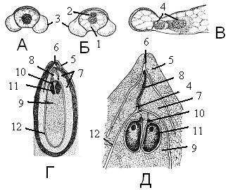 А – пыльцевое зерно; Б – образование мужского гаметофита; 1 – проталлиальная клетка; 2 – антеридиальная клетка; 3 – воздушные мешки; В – пыльцевая трубка; 4 – генеративные клетки (спермии); Г – продольный разрез семяпочки; Д – верхняя часть семяпочки; 5 – интегумент; 6 – микропиле; 7 – нуцеллус; 8 – пыльцевая трубка; 9 – эндосперм; 10 – шейка архегония; 11 – яйцеклетка; 12 – женский гаметофит.