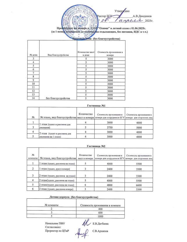 Прейскурант на номера пансионата СОЛ "Олимп" в летний сезон 2025 года