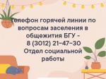 Телефон горячей линии по вопросам заселения в общежития БГУ - 8 (3012) 21-47-30 (Отдел социальной работы) с 09.00 до 17.00 ч., перерыв с 12 -13 ч.