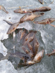 Пройдясь по льду Степного озера со студентами биологического отделения мы увидели темные пятна, и пробив лопатой уже тонковатый лед – мы увидели замерзшую рыбу! Причем, и взрослые особи, и еще почти мальки!