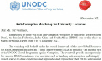 Так, проведением указанного семинара УНП ООН стремится «укрепить образование по вопросам борьбы с коррупцией, честности, неподкупности и этики в высших учебных заведениях по всему миру путем проведения мероприятий по наращиванию потенциала и разработки университетских материалов, которые преподаватели могут использовать для преподавания тем, связанных с коррупцией. Мероприятие было инициировано российским председательством в БРИКС еще в 2020 г., однако из-за эпидемиологических ограничений перенесено на этот год, и полностью финансируется за счет добровольного российского взноса в фонд УНП ООН.