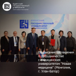 20 сентября 2024 г. в зале переговоров состоялась церемония подписания соглашения о сотрудничестве с Медицинским университетом "Новая медицина" (Монголия, г. Улан-Батор) в рамках юбилейных мероприятий Медицинского института, приуроченных к 25-летию Института. Соглашение о сотрудничестве включает возможность осуществлять обмен опытом в сфере образовательной деятельности, в области научной работы, обмен группами ученых, преподавателей и студентов.