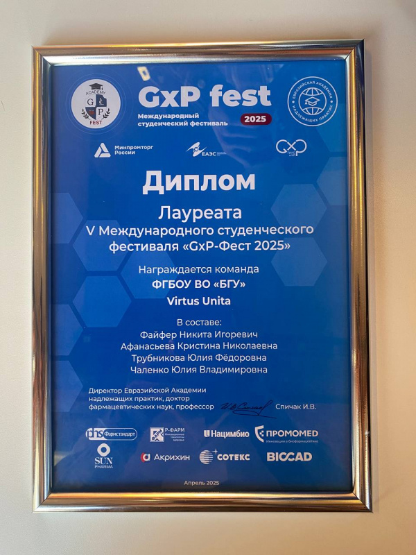 18 апреля 2025 года на площадке "Красный октябрь" в г. Москва состоялся финал V Международного студенческого фестиваля «GxP-Фест 2025». Партнерами данного фестиваля выступили ведущие фармацевтические предприятия страны - Фармстандарт, Р-Фарм, Акрихин, Промомед, BIOCAD и т.д. Студенты специальности "Фармация" достойно выступили и стали лауреатами «GxP-Фест 2025». Состав команды: Файфер Никита Игоревич (4 курс спец. "Фармация"), Афанасьева Кристина Николаевна (4 курс спец. "Фармация"), Трубникова Юлия Федоровна (4 курс спец. "Фармация"), Чаленко Юлия Владимировна (5 курс спец. "Фармация"). Наставники команды инженера-исследователа лаборатории инновационной фармацевтики Шевелева Екатерина Сергеевна, Лещева Юлия Николаевна и научный сотрудник лаборатории инновационной фармацевтики Бадмаев Гальчи Сахьянович. Поздравляем команду и наставников с успешным выступлением на фестивале!