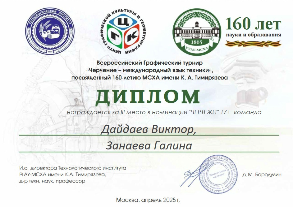 В результате заняли III место в номинации "Чертежи", 17+ команда колледжа БГУ в составе: Дайдаева Виктора и Занаевой Галины. Дайдаев В. и Занаева Г. разработали агродрон для автоматизированной обработки сельскохозяйственных угодий.