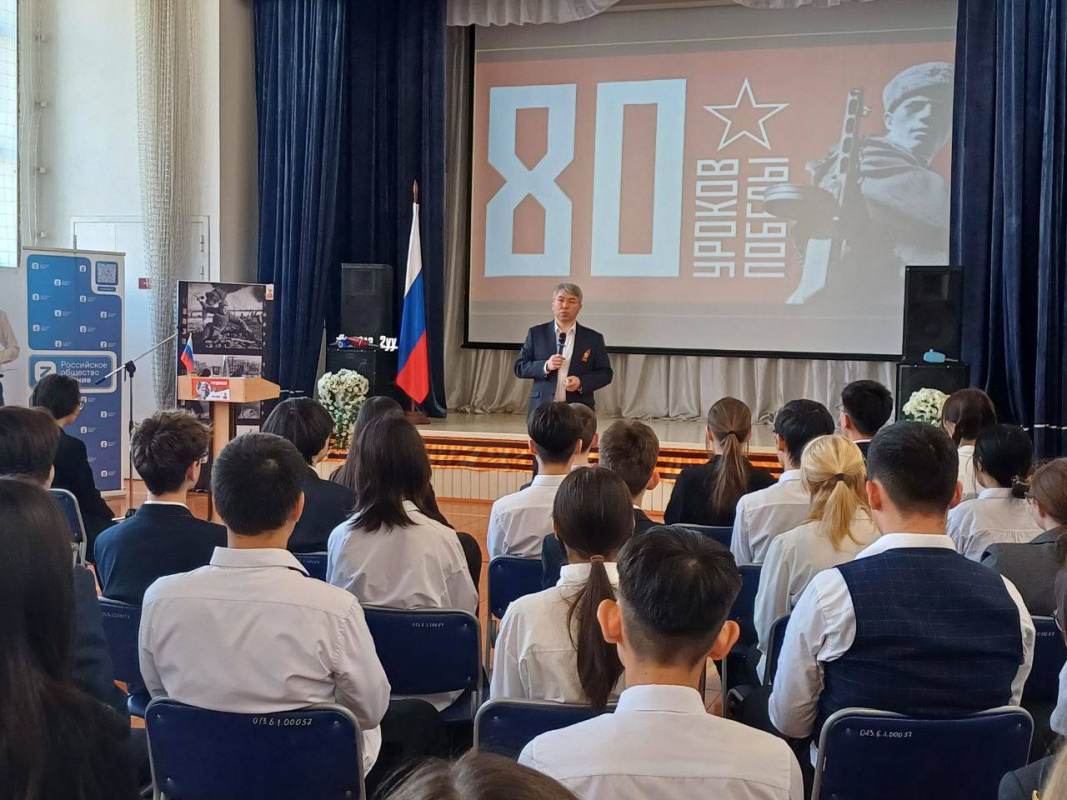 В рамах образовательной акции кафедры всеобщей и отечественной истории «80 уроков Победы» Глава Республики Бурятия Алексей Самбуевич Цыденов провёл «Урок Победы» для учеников средней общеобразовательной школы №2 с углублённым изучением отдельных предметов г. Улан-Удэ.