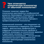 Основной вопрос, который возникает у выпускников и их родителей: чем отличается клиническая психология от психологии? Бакалавриат «Психология» - это первая ступень высшего образования, продолжительностью 4 года. Диплом бакалавра даёт выпускникам общую подготовку и знания в области психологии в целом, базу для начала карьеры в профессиональной психологии.