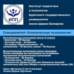 Институт педагогики и психологии Бурятского государственного университета имени Доржи Банзарова предлагает обучение по направлению «Клиническая психология». В вузе работают как научные сотрудники из разных областей (клинической психологии, медицины), так и специалисты-практики, за плечами которых богатый профессиональный опыт. Срок обучения составляет 5,5 лет. На это время молодым людям предоставляется отсрочка от армии. При поступлении на специальность «Клиническая психология» перед студентами открываются новые горизонты и возможности интересного пути их освоения.