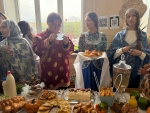 Затем жюри в составе председателя профбюро ИПП Бабикова В.А, заведующей производством столовой 4 корпуса Кожевниковой С.А, заведующего читальным залом 4 корпуса Ходоровой Д.Г., аспиранта кафедры общей педагогики Цзян Шоучжоу оценили представленные к защите ярмарочные столы.