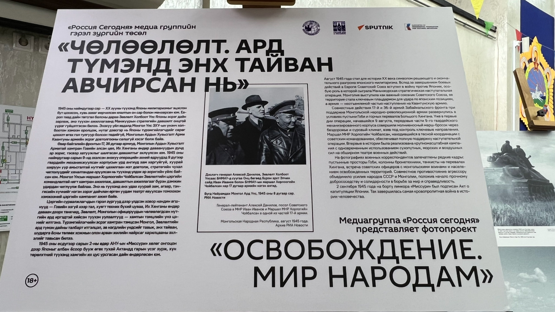 Данная выставка основана на уникальном фотоархиве Совинформбюро, правообладателем которого является медиагруппа «Россия сегодня». На фотографиях военных корреспондентов запечатлены редкие кадры: пустынные просторы Гоби, колонны бронетехники, танкисты на перевалах Хингана, встреча советских офицеров с монгольскими воинами и населением освобождённых территорий.