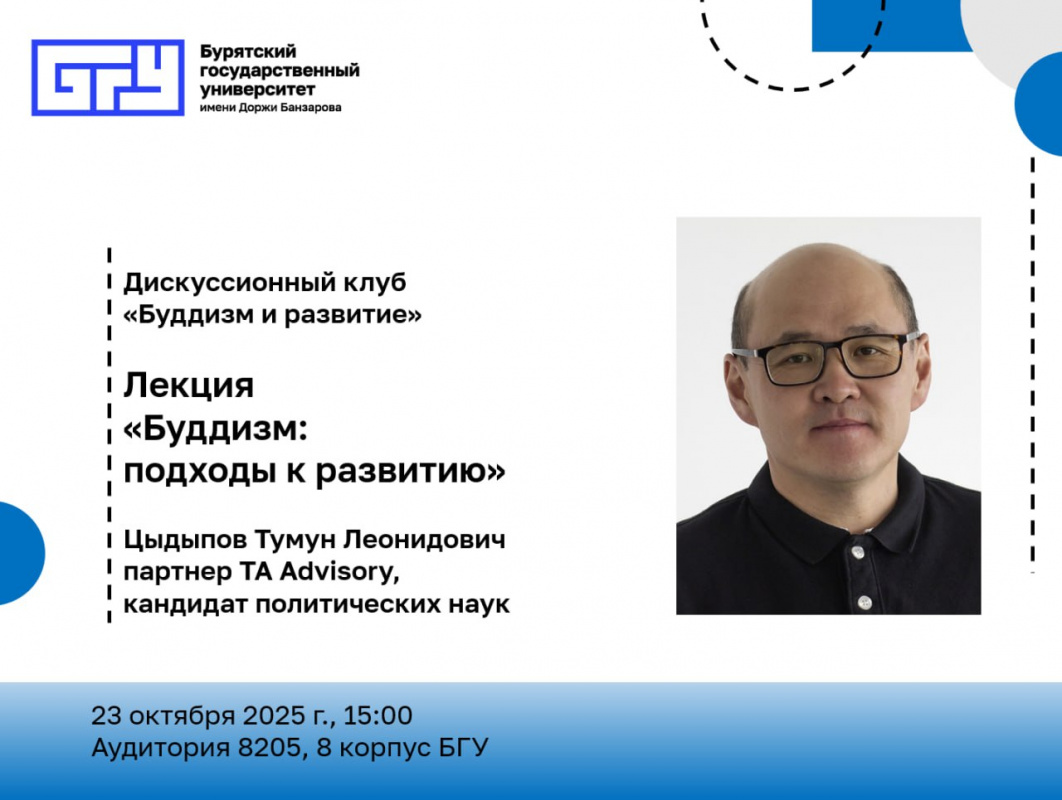 23 октября в 15.00 ч. в ауд 8205 8 корпуса БГУ в рамках дискуссионного клуба «Буддизм и развитие» состоится лекция Цыдыпова Тумуна Леонидовича «Буддизм: подходы к развитию»
