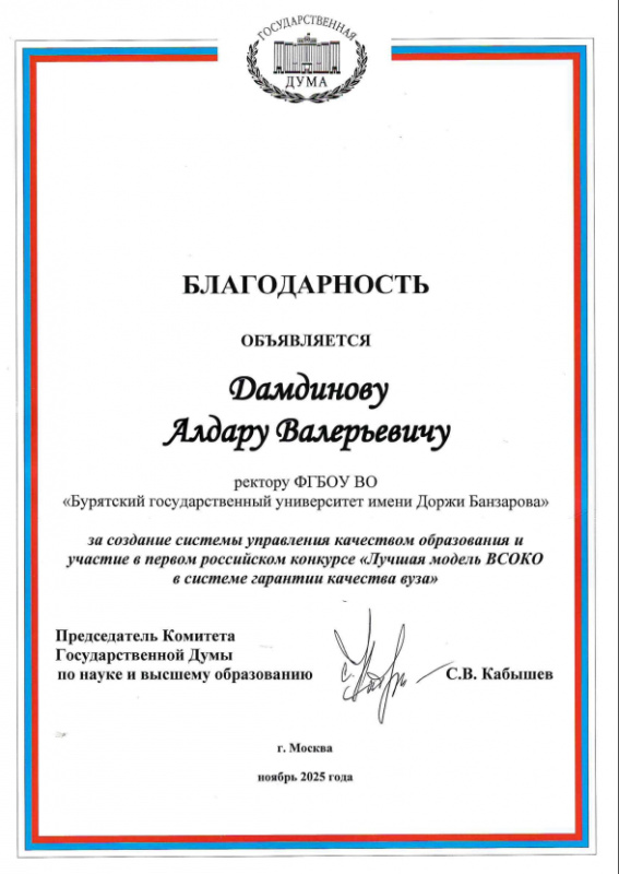 По итогам конкурса БГУ вошел в число финалистов, что подтверждает активную позицию университета в вопросах обеспечения качества образования. Особой гордостью стало получение Благодарности от Комитета Государственной Думы по науке и высшему образованию, адресованной ректору БГУ Дамдинову Алдару Валерьевичу. Это является свидетельством признания на федеральном уровне значимости работы по улучшению внутренней системы оценки качества образования БГУ.