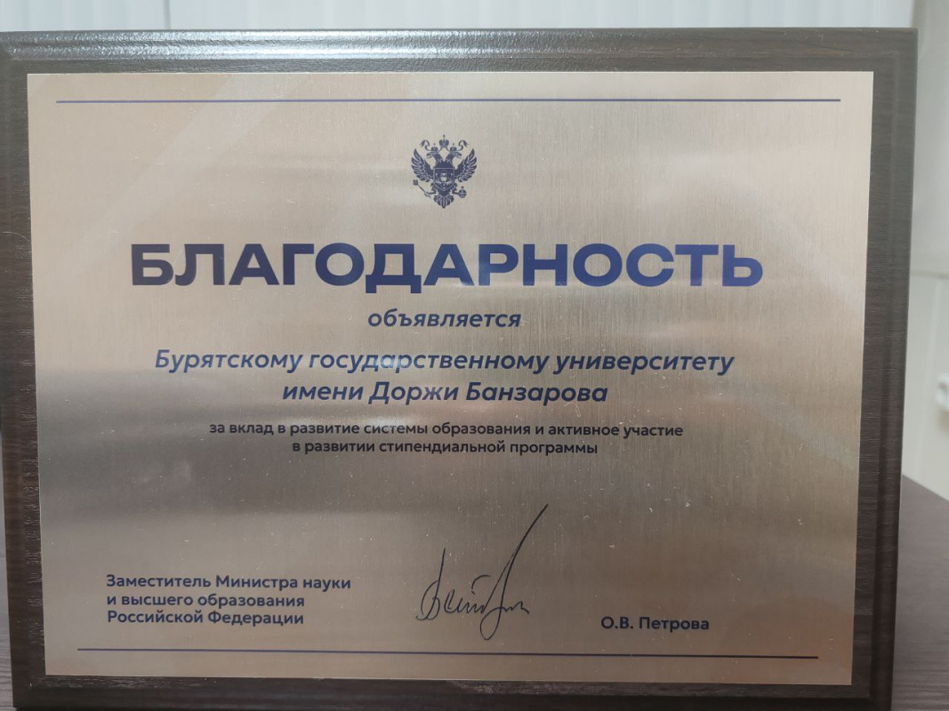 На Торжественной церемонии награждения Бурятский государственный университет был отмечен как один из лидеров по количеству стипендиатов Президента, Правительства РФ и именных стипендий в Дальневосточном федеральном округе. Нам вручено Благодарственное письмо Министерства науки и высшего образования Российской Федерации «За вклад в развитие системы образования и активное участие в развитии стипендиальной программы».