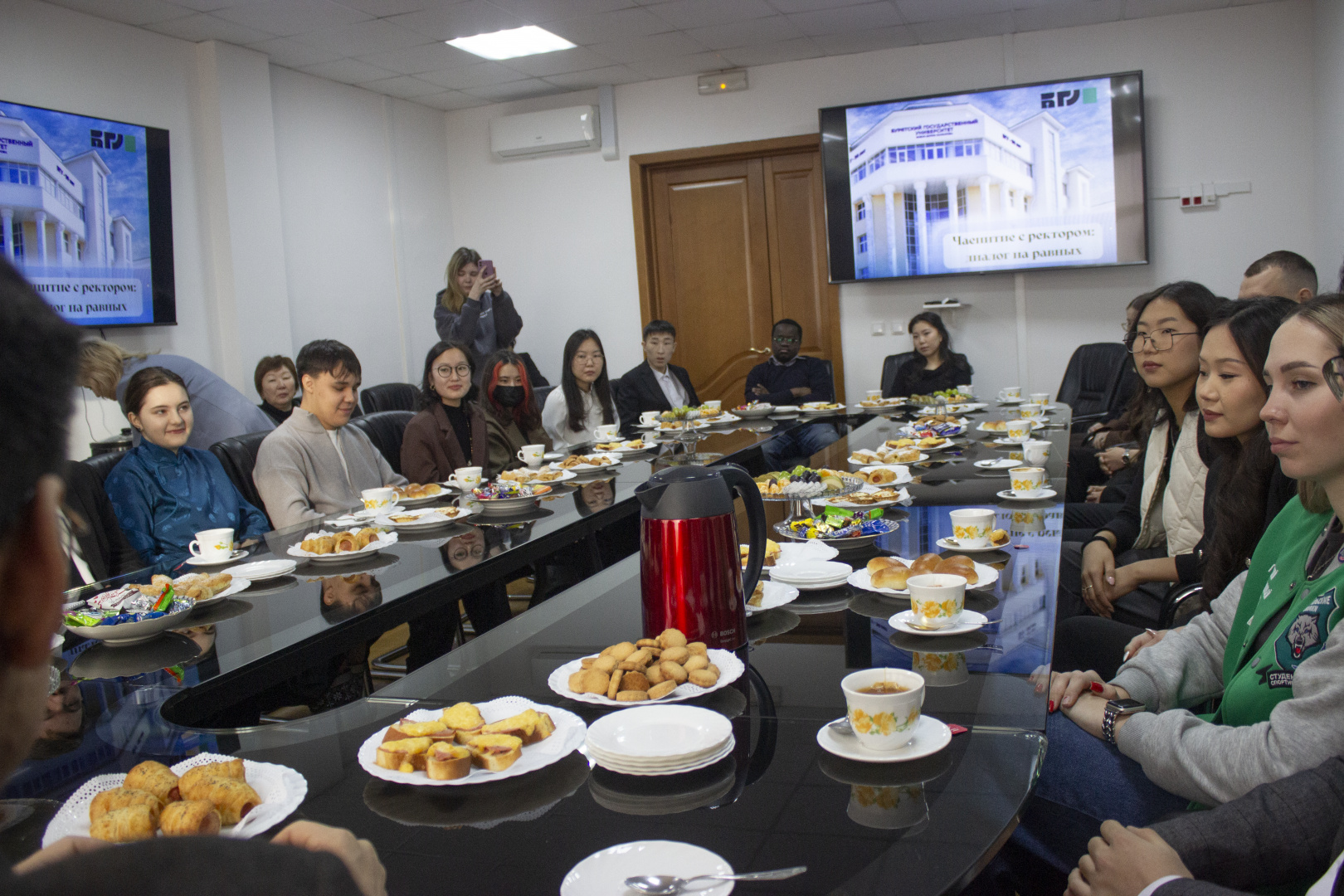 В праздничной обстановке за чашкой чая и угощениями студенты поделились своими успехами и планами, задали вопросы ректору и обсудили различные темы, которые затронули студенческий быт в общежитиях, стипендии, поддержку студенческих инициатив и проектов.