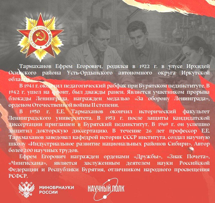 Особое место в рассказе заняло повествование о Ефреме Егоровиче Тармаханове - докторе исторических наук, профессоре, заслуженном деятеле науки РСФСР и Республики Бурятия, участнике Великой Отечественной войны.