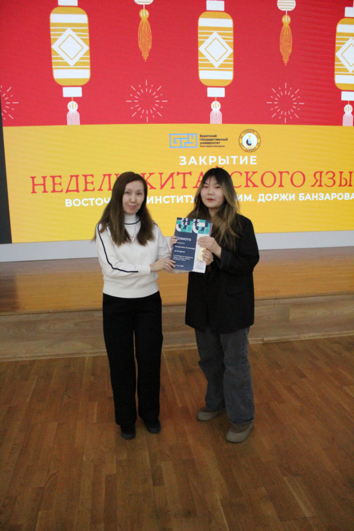 В награждении принимали участие заведующий кафедрой филологии стран Дальнего Востока, кандидат филологических наук, доцент Тугулова Ольга Доржиевна, директор Института Конфуция, кандидат исторических наук, доцент Ветлужская Лидия Леонидовна и профессор Чанчуньского политехнического университета, заместитель директора Института Конфуция Ян Ли.