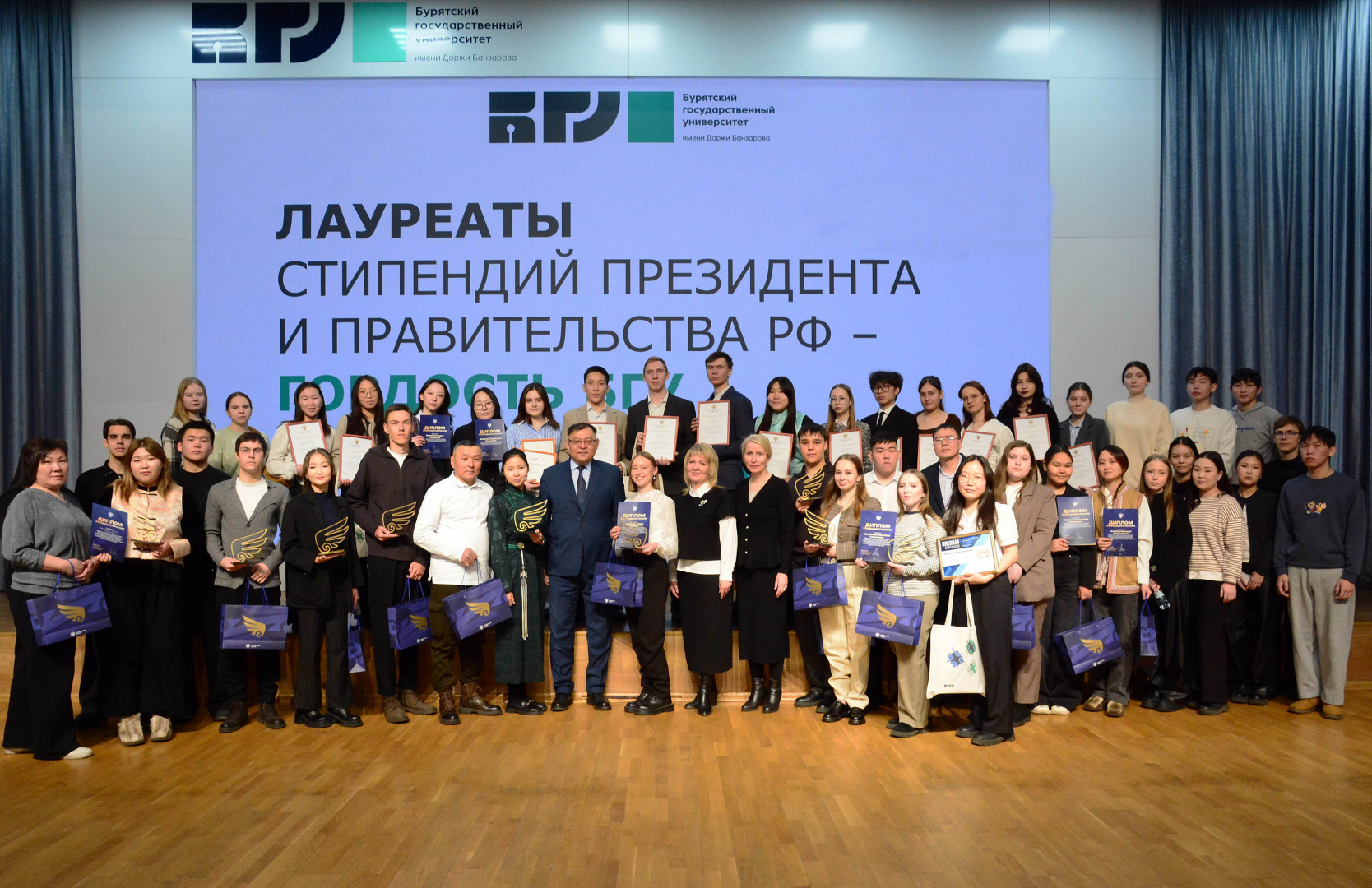 27 февраля в Бальном зале Бурятского государственного университета имени Доржи Банзарова состоялось торжественное событие, которое по праву можно назвать праздником интеллекта и таланта. Здесь собрались те, кто составляет гордость вуза, — лауреаты стипендий самого высокого уровня: Президента Российской Федерации, Правительства Российской Федерации, именной стипендии имени Г.И. Невельского, а также представители коренных малочисленных народов Севера, Сибири и Дальнего Востока, добившиеся выдающихся успехов в учебе и науке. Кроме того, на сцене чествовали самых ярких и активных студентов-волонтеров, чья работа была отмечена на всероссийском уровне.