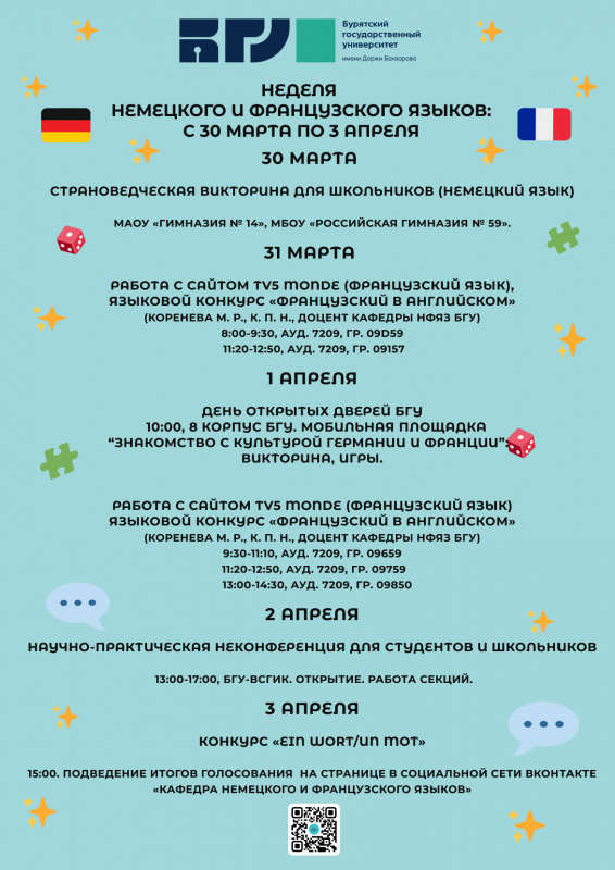 Кафедра немецкого и французского языков приглашает студентов и школьников принять участие в Неделе немецкого и французского языков, которая состоится с 30 марта по 3 апреля 2026 г.