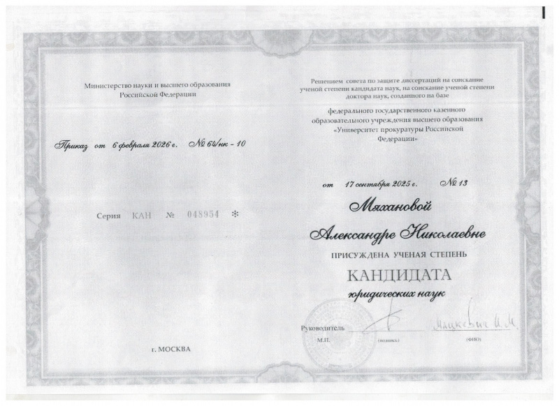 13 марта 2026 года доцент кафедры уголовного права, процесса и криминалистики Института права и экономики Мяханова Александра Николаевна приглашена в Университет прокуратуры Российской Федерации для вручения диплома кандидата юридических наук, выданного на основании приказа Министерства науки и высшего образования Российской Федерации наук от 06.02.2026 № 64/нк-10.