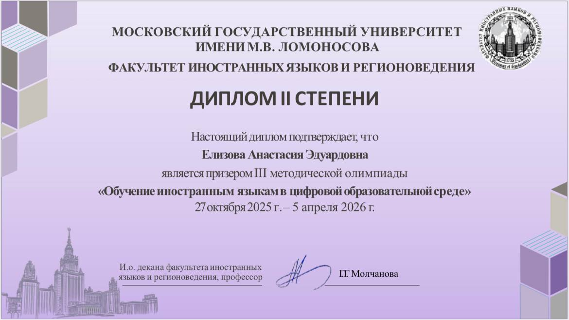 Она стала призёром III методической олимпиады «Обучение иностранным языкам в цифровой образовательной среде», организованной факультетом иностранных языков и регионоведения Московского государственного университета имени М.В. Ломоносова. Олимпиада проходила с октября 2025 года по апрель 2026 года в заочном формате и объединила 133 участника из многих регионов России и ближнего зарубежья.