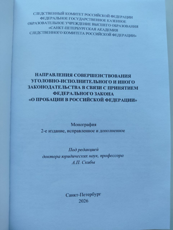 Под редакцией декана факультета подготовки научно-педагогических кадров и организации научно-исследовательской работы Санкт-Петербургской Академии Следственного Комитета Российской Федерации, члена Союза криминалистов и криминологов, доктора юридических наук, профессора Андрея Петровича Скибы в издательстве «ИНФРА-М» опубликована коллективная монография «Направления совершенствования уголовно-исполнительного и иного законодательства в связи с принятием федерального закона «О пробации в Российской Федерации».
