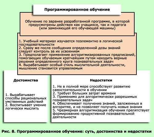 В отечественной науке теоретические основы программированного обучения активно изучались, а также внедрялись достижения на практике в 70-х гг. ХХ в. Одним из ведущих специалистов является профессор Московского университета Нина Федоровна Талызина (Талызина Н.Ф., 1969; 1975). В отечественном варианте этот тип обучения базируется на так называемой теории поэтапного формирования умственных действий и понятий П.Я. Гальперина (Гальперин П.Я., 1998; аннотация) и теории кибернетики. Реализация программированного обучения предполагает выделение по каждому изучаемому предмету специфических и логических приемов мышления, указания рациональных способов познавательной деятельности в целом. Только после этого возможно составление обучающих программ, которые направлены на формирование этих видов познавательной деятельности, а через них и тех знаний, которые составляют содержание данного учебного предмета.