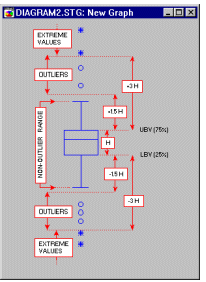 2М диаграммы размаха - Прямоугольники - Отрезки. На диаграммах размаха этого типа вокруг средней точки (т.е. среднего или медианы) рисуются прямоугольник, представляющий выбранный диапазон (т.е. стандартную ошибку, стандартное отклонение, минимум-максимум или константу), и отрезок, также отражающий выбранный диапазон, концы которого расположены вне прямоугольника (см. следующий рисунок).