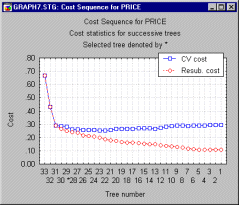 Как видно из графика, цена обучения (например, доля неправильных классификаций в обучающей выборке) заметно уменьшается с увеличением размера дерева. В то же время, цена кросс-проверки с ростом размера дерева быстро достигает минимума, а затем - для очень больших размеров дерева - начинает расти. Обратите внимание на то, что выбранное дерево "подходящего размера" располагается близко к точке перегиба этой кривой, то есть близко к той точке, где первоначальное резкое уменьшение цены кросс-проверки начинает сходить на нет. Процедура "автоматического" выбора дерева направлена на то, чтобы выбирать наиболее простое (наименьшее по размеру) дерево с ценой кросс-проверки, близкой к минимальной, и тем самым избегать потери точности прогноза, происходящей от "недо-" или " пересогласованности " с данными (похожая логика используется в графике каменистой осыпи для определения числа факторов в факторном анализе, см. также Просмотр результатов анализа главных компонент)
