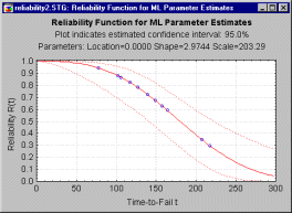 Процентные точки функции надежности. Основываясь на подогнанной функции распределения Вейбулла, можно вычислить процентили функции надежности (функции выживания) вместе с доверительными границами (для оценок максимального правдоподобия). Эти оценки особенно важны для вычисления ожидаемой доли образцов, выживших к определенному моменту времени.
