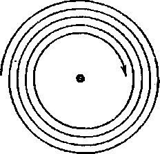 -частиц свидетельствуют в пользу ядерной модели атома, предложенной Резерфордом. Однако ядерная модель оказалась в противоречии с законами классической механики и электродинамики. Поскольку система неподвижных зарядов не может находиться в устойчивом состоянии, Резерфорду пришлось отказаться от статической модели атома и предположить, что электроны движутся вокруг ядра, описывая замкнутые траектории. Но в этом случае электрон будет двигаться с ускорением, в связи с чем, согласно крассической электродинамике, он должен непрерывно излучать электромагнитные (световые) волны. Процесс излучения сопровождается потерей энергии, так что электрон должен в конечном счете упасть на ядро (рис. 186).