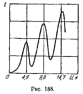 Определялась зависимость силы тока i в цепи анода (измерявшейся гальванометром Г) от напряжения U. Полученные результаты представлены на рис. 188. Сила тока вначале монотонно возрастает, достигает максимума при U = 4,9 в, после чего с дальнейшим увеличением U резко падает, достигает минимума и снова начинает расти. Максимумы силы тока повторяются при U, равном 9,8 в, 14,7 в и т. д.*).