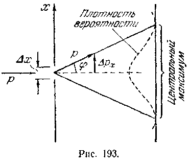 прохождения частицы через щель ее составляющая импульса рх имеет точное значение, равное нулю (щель по условию перпендикулярна к импульсу), так что Лрх — О, зато координата х частицы является совершенно неопределенной, В момент прохождения частицы через щель положение меняется. Вместо полной неопределенности координаты х появляется неопределенность Ах, но это достигается ценой утраты определенности значения рх. Действительно, вследствие дифракции имеется некоторая вероятность того, что частица будет двигаться в пределах угла 2ср, где Ф — угол, соответствующий первому дифракционному минимуму (максимумами высших Рис. 194. порядков можно пре-