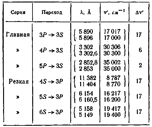 состоит из двух линий с длинами волн 5890 А и 5896 А. То же относится и к другим линиям главной серии, а также к линиям других серий. В табл. 4 приведены некоторые дублеты натрия. В четвертом столбце указаны волновые числа линий v' [см. (59.2)]. В последнем столбце дано расщепление компонент дублетов (разность волновых чисел).
