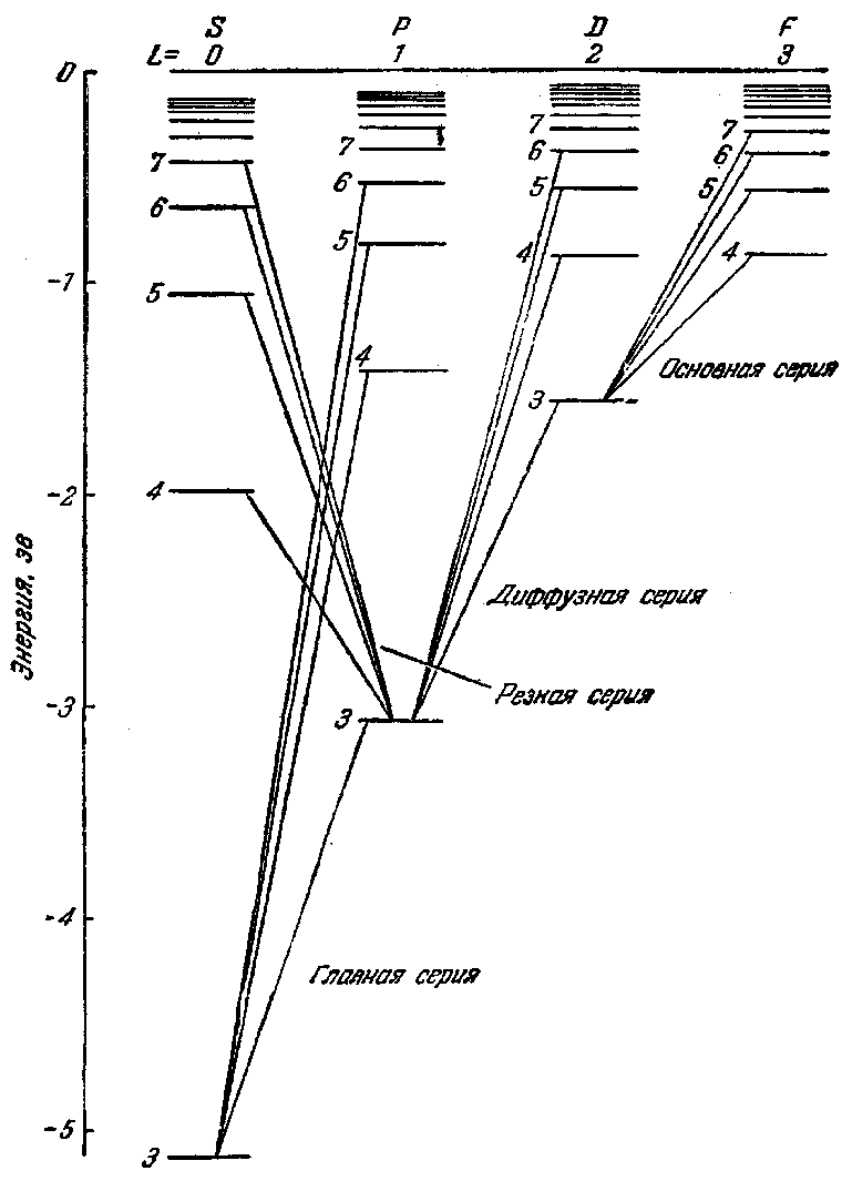 Терм с точностью до постоянного множителя совпадает с энергией соответствующего состояния атома [см. формулу (62.2)]. Следовательно, каждому ряду спектральных термов должен соответствовать свой ряд энергетических уровней. Эмпирическая схема уровней атома натрия изображена на рис. 200. Схемы уровней других щелочных металлов имеют такой же характер, как у натрия.