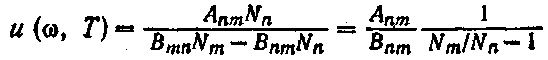 , Эйнштейн дал весьма простой вывод формулы Планка. Равновесие Между веществом и излучением будет достигнуто при условии, что число атомов Mi в каждом из состояний остается без изменений. Это возможно только в том случае, если число атомов, переходящих в единицу времени из состояния п в состояние т, будет равно числу атомов, совершающих переход в противоположном направлении. Пусть