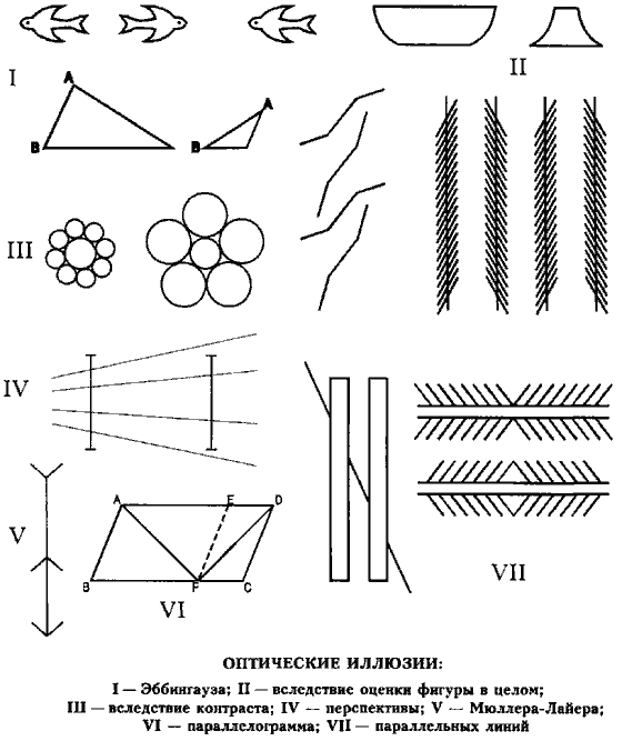 Значение структуры целого для восприятия входящих в состав его частей обнаруживается очень ярко и наглядно в некоторых оптико-геометрических иллюзиях. Во-первых, воспринимаемая величина фигур оказывается зависимой от окружения, в котором они даны, как это видно из рисунка (оптические иллюзии), где средние круги равны, но видятся нами неравными. Очень яркой является иллюзия Мюллера-Лайера и ее эббингаузовский вариант. Иллюзии, изображенные на этом рисунке, показывают, что воспринимаемые размеры отдельных линий оказываются зависимыми от размеров тех фигур, в состав которых они входят. Особенно показательна в этом отношении иллюзия параллелограмма, в которой диагональ меньшего из четырехугольников кажется меньшей, а большего большей, хотя объективно они равны.