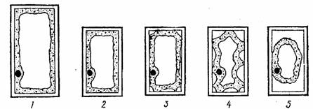 время погружения и через каждые 5 минут (4 раза) рассматривать объект в микроскоп и фиксировать степень (форму) плазмолиза (рис.12). Результаты исследования заносить в