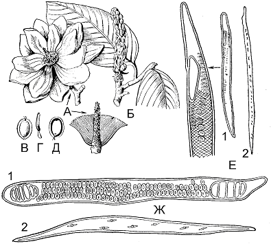 Магнолия Кемпбелла (Magnolia campbellii). А – общий вид цветка, он же без околоцветника; Б – репродуктивный побег; В – семя; Г – тычинка; Д – разрез через семя;