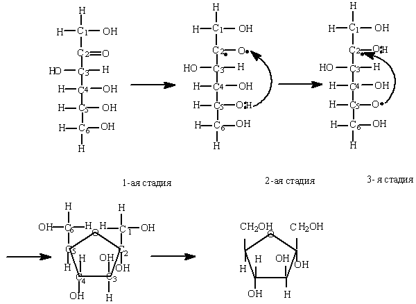 На втором этапе атом водорода со своим электроном отщепляется от гидроксильной группы, принадлежащей пятому атому углерода (С5) начинает взаимодействовать с неспаренным электроном кислорода в карбонильной группе с образованием гидроксильной (спиртовой) группы -ОН.