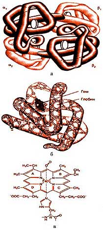 Рис.2. Строение гемоглобина (а); его субъединицы (б) и структура гема (в).