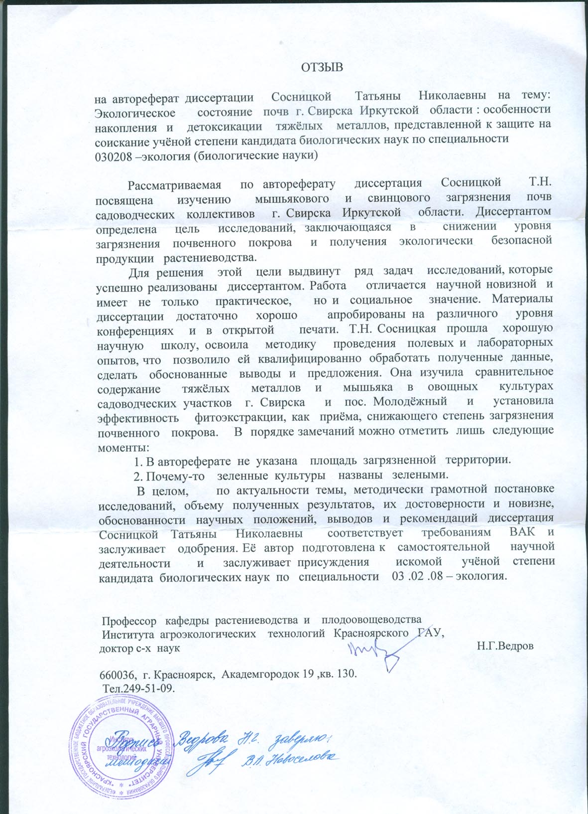 1. Принять к защите диссертационную работу Сосницкой Татьяны Николаевны «Экологическое состояние почв г. Свирска Иркутской области: особенности накопления и детоксикации тяжелых металлов» на соискание ученой степени кандидата биологических наук по специальности 03.02.08 – экология (биологические науки).