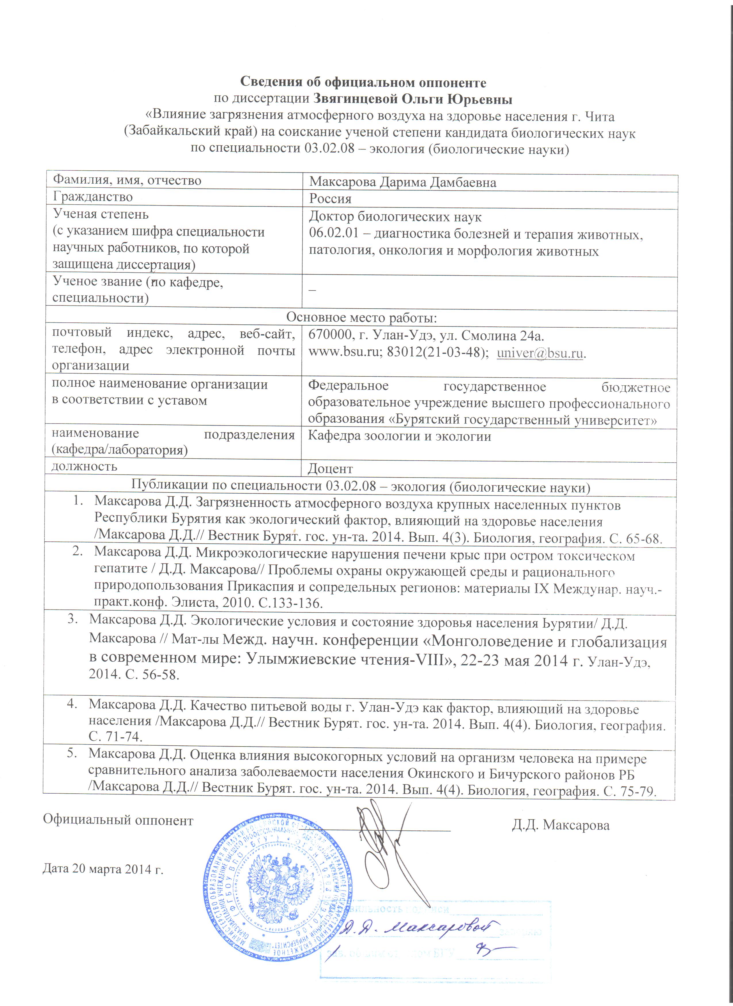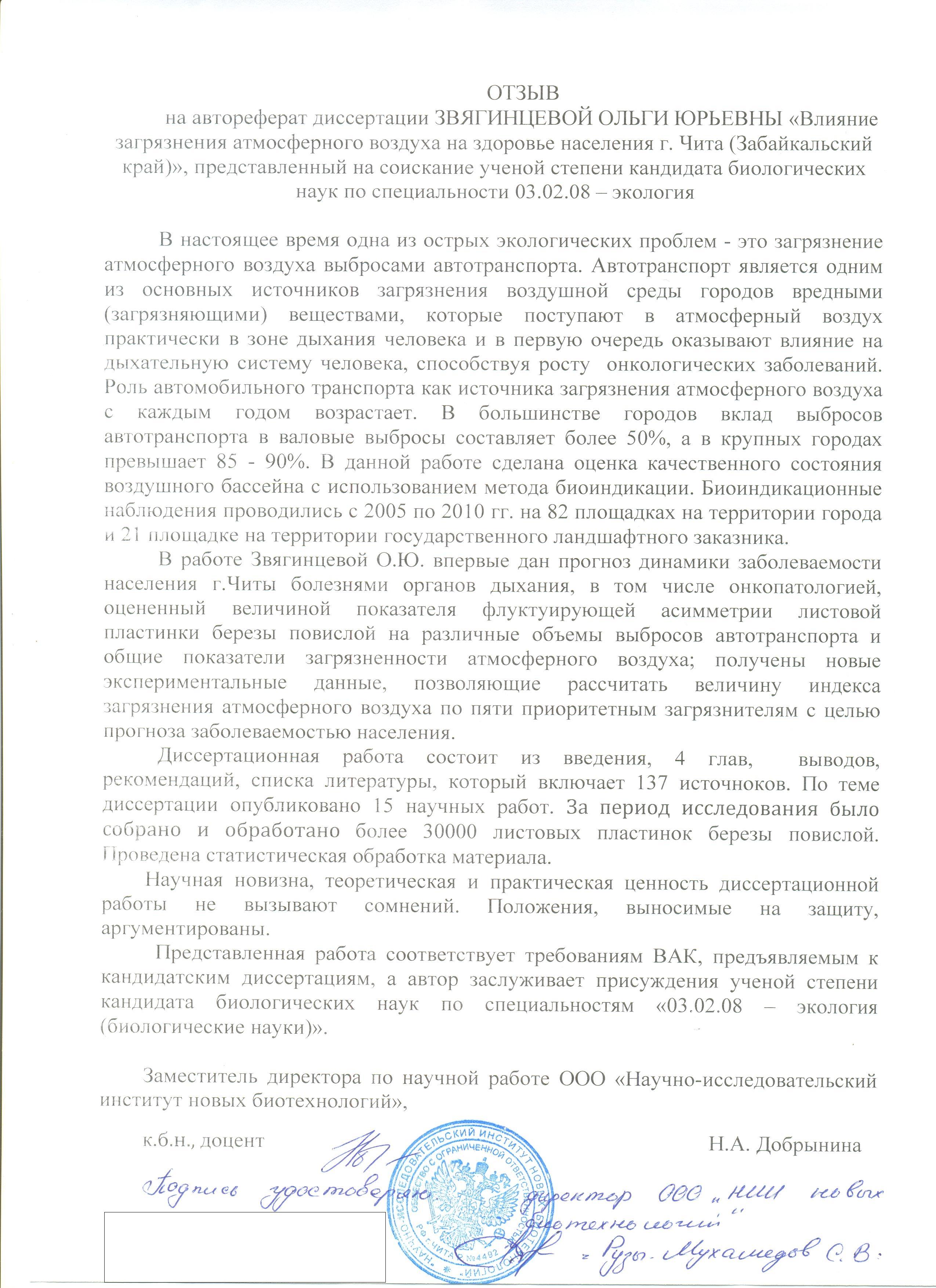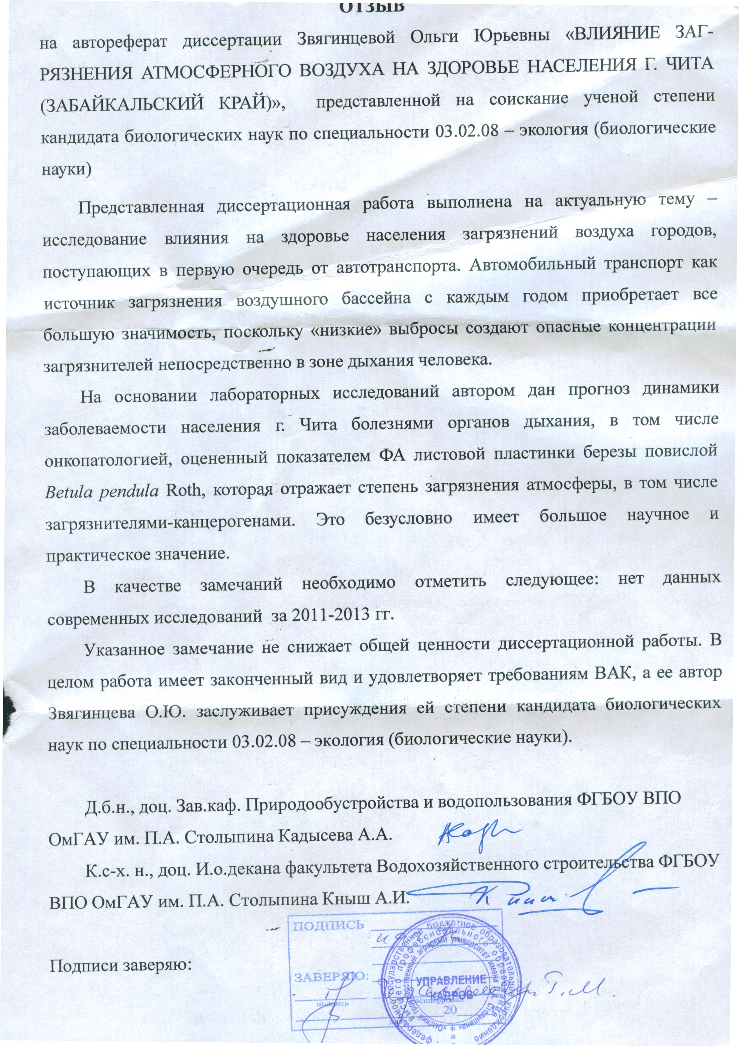 1. Принять к защите диссертационную работу Звягинцевой Ольги Юрьевны «Влияние загрязнения атмосферного воздуха на здоровье населения г. Чита (Забайкальский край)» на соискание ученой степени кандидата биологических наук по специальности 03.02.08 – экология (биологические науки)