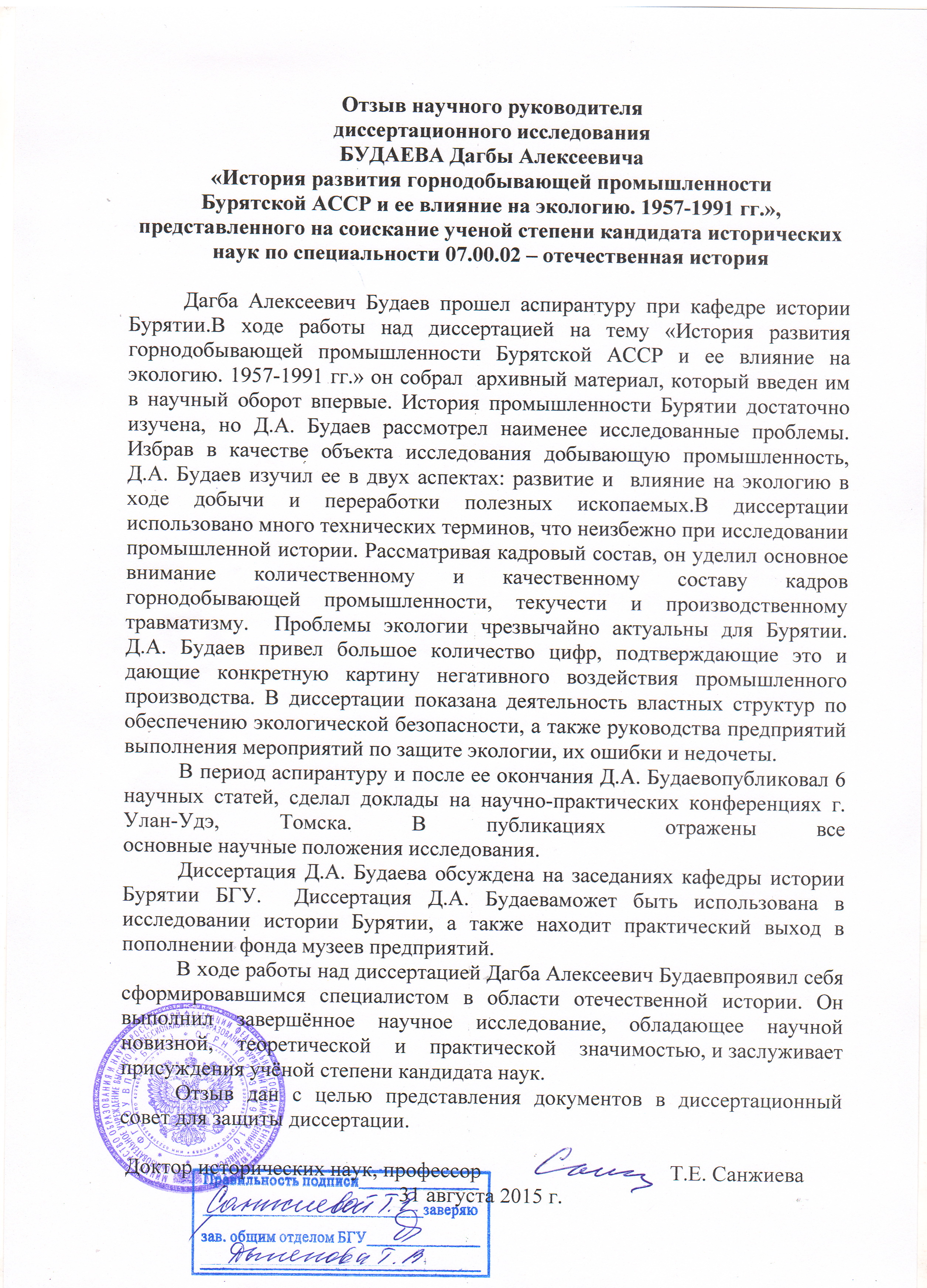 В соответствии с п. 35 «Положения о порядке присуждения ученых степеней» Диссертационный совет Д 212.022.07 сообщает следующие сведения о результатах публичной защиты: На заседании 20 ноября 2015 г. (Протокол №3) диссертационный совет принял решение присудить Д.А. Будаеву ученую степень кандидата исторических наук по специальности 07.00.02. – Отечественная история. Диссертация «История развития горнодобывающей промышленности Бурятской АССР и ее влияние на экологию (1957-1991 гг.)».