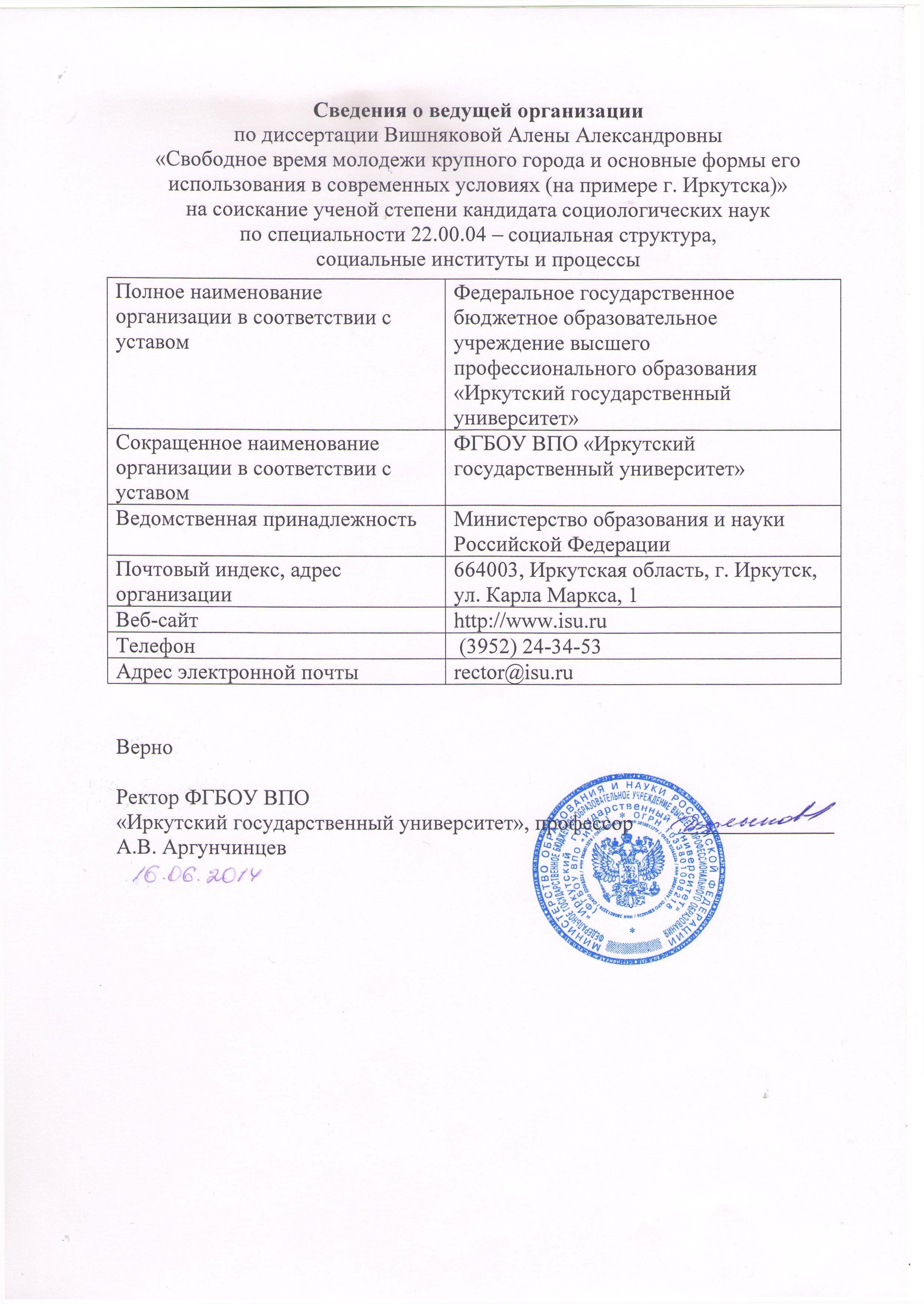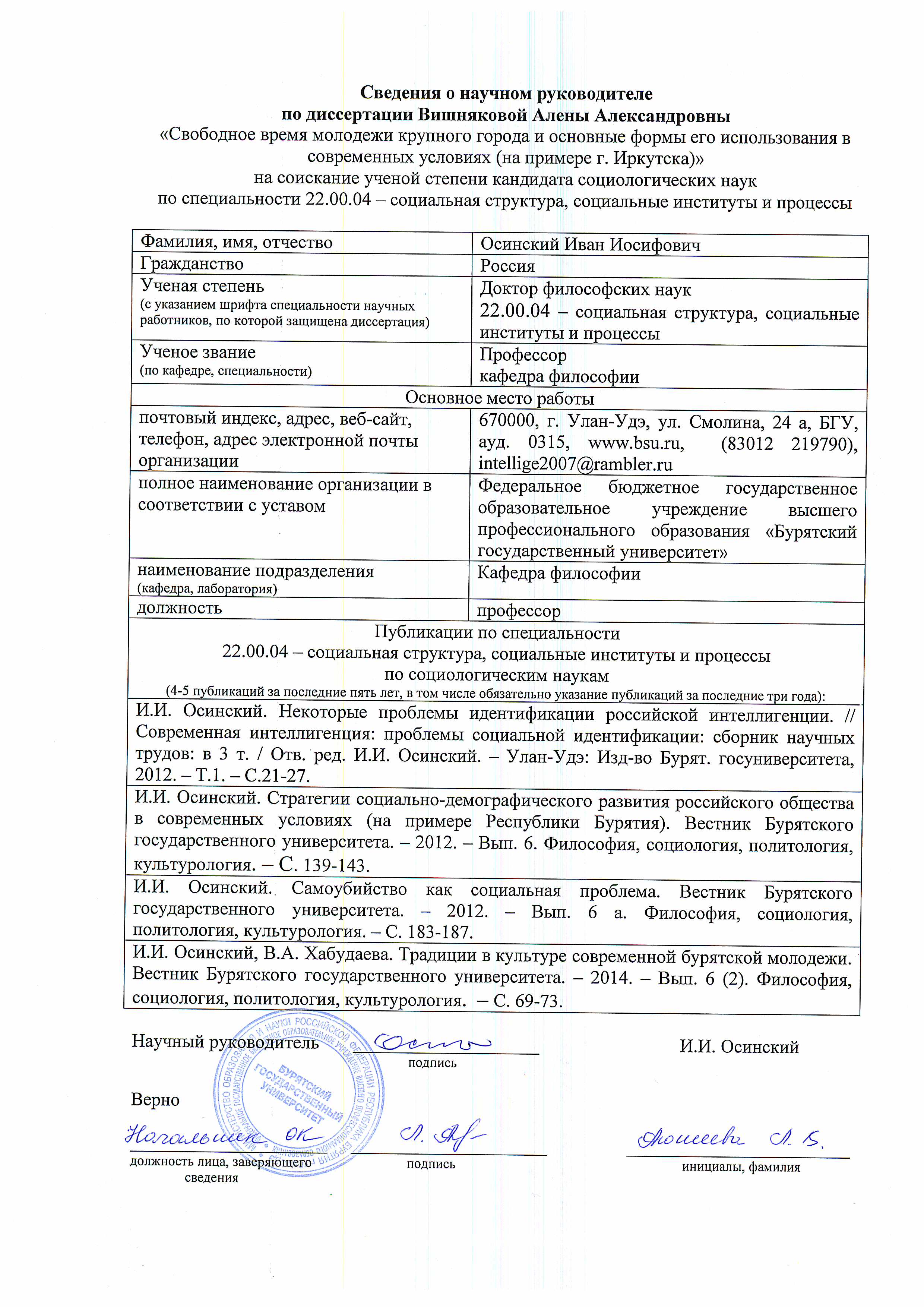 1. Принять к защите диссертационную работу «Свободное время молодежи крупного города и основные формы его использования в современных условиях (на примере г. Иркутск)» по специальности 22.00.04 – социальная структура, социальные институты и процессы.