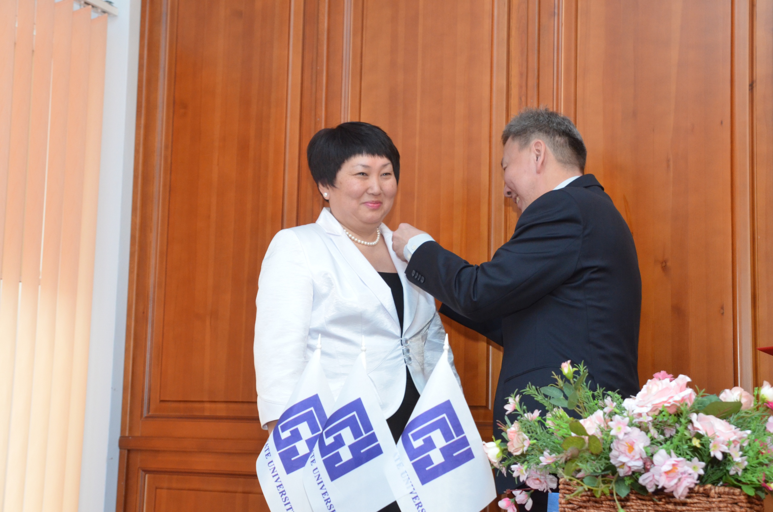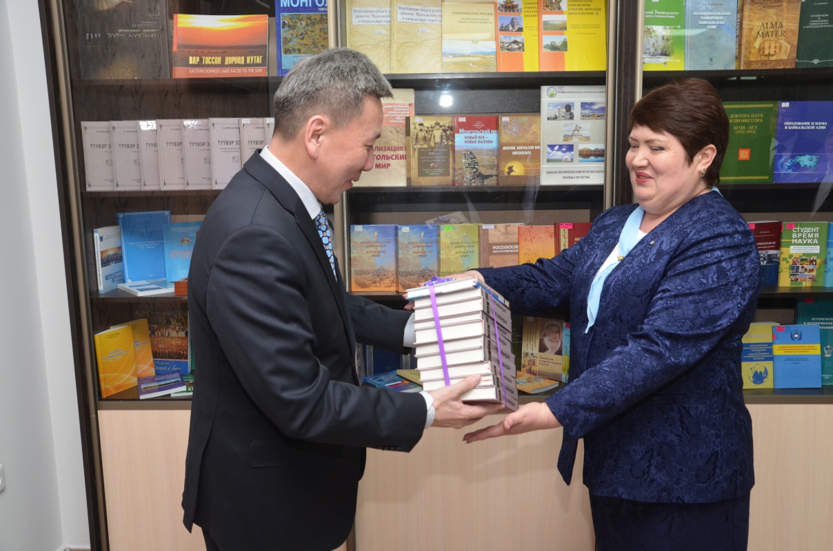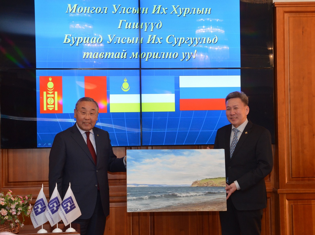 В ответ ректор БГУ Степан Калмыков вручил юбилейную медаль в честь 80-летия образования БГПИ-БГУ руководителю делегации Л. Болду, вице-консулу Генерального консульства Монголии в Улан-Удэ господину Г. Жаргалсайхану, доценту Восточного института госпоже С. Монхтувшин.